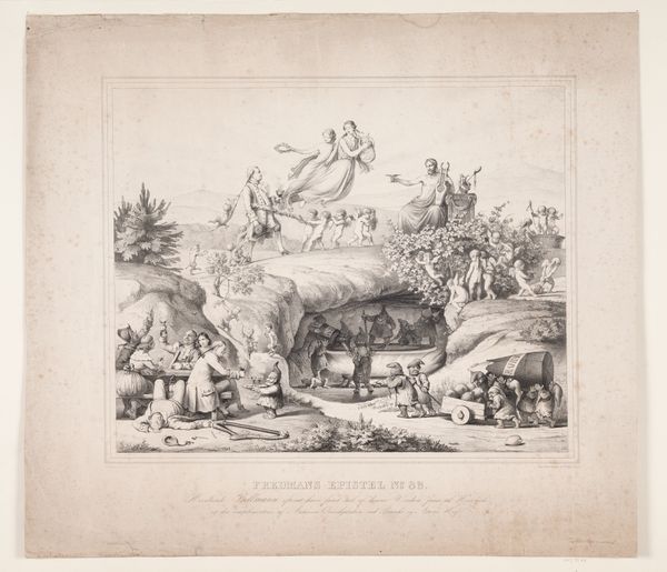 Curator: This delicate pen, etching and engraving print is titled "Proposal for Engraving by Subscription From an Original Picture Painted by Zuccarelle." It's by William Austin, dating back to 1756. Editor: Ah, a landscape framed by what seems like architectural ruins. There's a wistful, almost melancholic feeling about it, don’t you think? Curator: I agree, it has a picturesque quality that speaks to the 18th-century fascination with ruins and the romanticizing of nature. What’s interesting is its purpose. This wasn't intended as a standalone work of art, but rather as an advertisement, if you will. Editor: A sales pitch masquerading as art? I like it. The framing feels very performative then, almost theatrical, like unveiling a grand spectacle that needs subscribers, patrons eager to buy into the fantasy. Curator: Precisely! Austin is essentially advertising a future print based on a painting by Zuccarelli, and using this detailed engraving to entice buyers. The text inscribed within the image outlines the proposal terms, detailing sizes and payments. Editor: So it's a piece of marketing ephemera? The landscape at the heart is serene. There is a lone rider going along a river. Despite that one active element though, the piece seems like an ode to memory more than a picture of progress, highlighting both natural and architectural decline in such decorative style. Curator: Exactly. Look at the blend of promotional text with allegorical motifs. By combining utility with artistry, Austin elevates his advertisement. This tells us so much about the relationship between art, commerce, and audience expectation in the 18th century. Editor: It’s remarkable how something so explicitly transactional can still evoke such a mood. A smart way of blending artistic expression with economic realities! A call for support cloaked in the picturesque beauty it promised to deliver, literally! Curator: Right? A poignant blend. An ode to what *was* that reminds us how inextricably linked art, the market, and nostalgia can be.