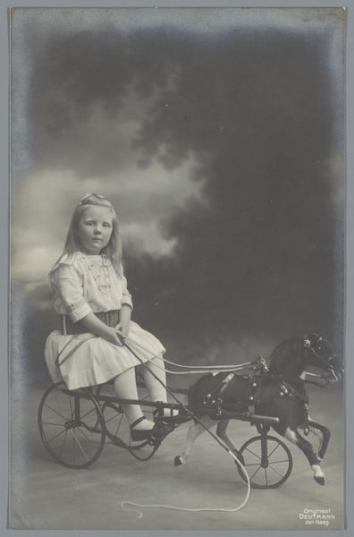 Curator: Here we have a photograph titled "Vrouw met twee peuters met dezelfde kleding en petten in een bolderkar, waarschijnlijk de tweeling Ad en Johanna van der Kop en een familielid," taken after 1901, part of the Rijksmuseum collection. Editor: It has a rather wistful mood, don’t you think? The tonal range is limited, sepia washes over everything, softening details but also lending it this dreamlike quality. Curator: From a compositional standpoint, notice the interplay of verticals and curves: the rigid verticality of the woman contrasts sharply with the circular wheels of the wagon, a dynamic opposition within the image’s frame. Editor: Yes, and those wheels immediately made me think about the cyclical nature of life, childhood captured as fleeting, perpetually turning toward what's next, with the matching sailor outfits hinting at social uniformity. Curator: The image plane is subtly divided, as well. The woman occupies the left third, planted, sturdy, while the wagon and children claim the rest, opening towards the right, guiding the eye through a soft, landscaped space. Editor: Indeed, there is something undeniably poignant about the symbols chosen here. The bolderkar itself evokes journey, nurture and dependence, while the formal dress mirrors turn-of-the-century constraints and a societal desire for control even in these earliest years. Curator: Absolutely. The photographer’s intention is likely to depict familial harmony, however the visual tensions—between stasis and movement, the natural and constructed—inject the photograph with latent dynamic ambiguity. Editor: The twins in matching garb echo familiar ideas of family bonds and heritage, creating little symbolic doppelgangers of an ideal that may conceal more complicated individual identities as time advances. I am interested by the woman. She stands firm while bearing all this! Curator: Interesting how we respond differently. For me, she grounds the photo; its stable axis. But I appreciate the emotional undercurrents you find within the layers of symbolic encoding. Editor: That is why these family photos are important in connecting individual memory to larger ideas. It's interesting to note the differences. Thank you. Curator: Thank you; a thought-provoking assessment.