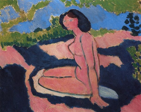 Curator: Let’s turn our attention to Max Pechstein’s “Girl. Sitting Female Nude,” an oil on canvas painted in 1910. Editor: It feels… intensely raw, almost confrontational. The color palette is so unexpected: the green-tinged skin, those vivid red accents on her cheeks and lips! It unsettles, which, I guess, is the point? Curator: Exactly! Pechstein, deeply involved with the Expressionist group Die Brücke at the time, uses color and form not to imitate reality but to convey inner emotional states. Note how the lines, though representational, are thick and deliberately unrefined. Editor: You can see that the brushstrokes really work to emphasize form. Her posture is a very compressed and powerful shape. Do you think the color palette, particularly the unsettling green hue to the figure’s skin, plays with perceptions of beauty? Curator: Undoubtedly. Expressionists often aimed to disrupt conventional aesthetics. It rejects the academic ideal of the nude, offering instead a visceral, almost jarring portrayal of the human form, there’s an honesty to this rawness that, to me at least, becomes its own kind of beauty. The artist's unique ability lies in blending reality and the world of emotions, capturing this interesting dichotomy through each careful brushstroke. Editor: And that backdrop! Is that supposed to be a landscape? It looks almost abstract, which makes the figure even more prominent. Curator: Yes, that ambiguous setting definitely isolates her, forcing us to focus on the figure’s pose, her gaze turned directly outward, a direct and unwavering stare. Editor: I almost wish the face was obscured because she’s challenging us as viewers, even after all these years, isn’t she? It's fascinating how Pechstein captures a sense of the sitter's thoughts through such boldly distorted colors and brusque lines. Curator: Yes, "Girl. Sitting Female Nude" is less about perfect anatomical accuracy, more about capturing the force and feelings of a particular time and moment in modern art history. Editor: Thinking about that initial rawness, I wonder whether part of the ongoing appeal, despite the art world’s evolution, lies in this unflinching intensity? Curator: It remains to provoke us even today by pushing boundaries, doesn’t it?