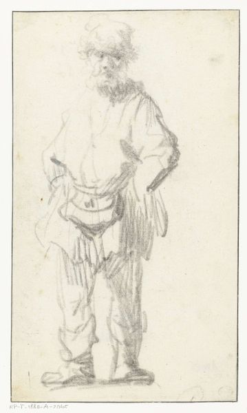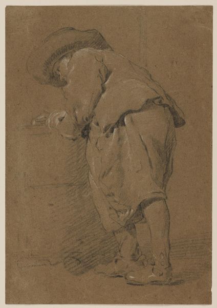 Curator: The subject of this drawing, currently held at the Harvard Art Museums, is titled, "The Italian Doctor Facing Left," sketched by Claude Gillot. Editor: There's a theatrical weight to the garment, isn't there? All that fabric, carefully delineated with red chalk to emphasize its material presence. Curator: Yes, the figure is a stock character from the Commedia dell'arte. Note the hooked nose, the voluminous hooded robe, all contributing to a rather sinister persona. Editor: I'm interested in the drawing's function; it has the quality of a quick study. The economy of line suggests that Gillot was interested in capturing a fleeting expression or pose. Curator: These characters functioned as archetypes, their costumes and mannerisms instantly recognizable to audiences. They become vessels for satire, reflecting societal anxieties. Editor: The means of production are fascinating. Red chalk would have been a relatively accessible medium, facilitating quick sketches and studies for larger, perhaps more elaborate works. Curator: It's interesting to consider how the performance and its representation, in turn, reinforced certain stereotypes about doctors and Italians. Editor: Thinking about the context helps us appreciate the artist's material choices, and how readily accessible materials like red chalk shaped artistic practice and visual culture. Curator: Indeed. Examining it through the lens of cultural memory, we can see how these figures continue to resonate and inform our understanding of identity and power. Editor: Ultimately, this sketch reveals the interplay between artistic skill and the social dimensions of artistic production.