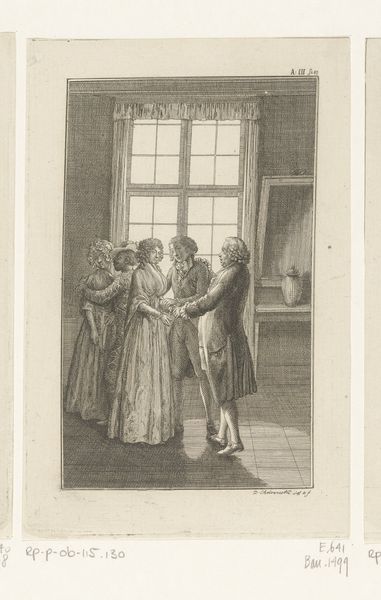 Reinier Vinkeles created this print, "Oudere man zegent een jong paar" (Older man blessing a young couple), in the Netherlands in the late 18th or early 19th century. It reflects the social emphasis on family and the ritualistic aspects of marriage during that time. The image depicts a formal interior where an older man, presumably a father or patriarch, is blessing a young couple by joining their hands. The act signifies the transfer of familial approval and perhaps even property or social status. It is staged in a domestic setting, possibly a parlor, which suggests the private yet ceremonious nature of such an event. The cultural norms of the Netherlands at this time valued social stability and the preservation of family honor, something very important in Dutch society. As historians, our understanding is enriched by researching the social customs and legal frameworks surrounding marriage in the Netherlands during this period. Archival documents, such as marriage contracts and family records, provide a deeper insight into the significance of this blessing and its place within the broader social and institutional context.