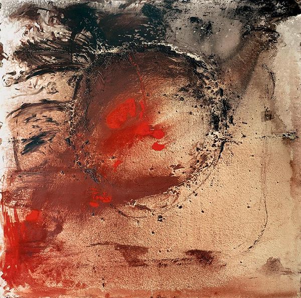 Editor: Mikuláš Medek's mixed media piece, "Too Much Alcohol," created in 1964, definitely evokes a sense of unease with its stark contrast and abstract form. It feels almost… violent. What’s your interpretation of this work? Curator: It's interesting you pick up on the violence, I think that reading holds true considering Medek's socio-political context in Czechoslovakia at the time. Artists under communist rule often used abstraction to subtly critique authority. The "alcohol" in the title, then, might be a metaphor for the numbing effect of oppression, with the red symbolizing suppressed anger and trauma. The almost diagrammatic lines create a constricting structure, like institutional limitations imposed by the State. Do you see how this painting seems to push back against the idealized socialist realism favored by the regime? Editor: I didn’t consider that perspective. So the abstraction wasn’t just an aesthetic choice, but also a form of coded protest? It's clever how it disguises itself. Curator: Precisely. Matter painting, a sort of material-focused abstraction, offered an escape from the explicit propagandistic narratives pushed by the government. By focusing on form and texture, Medek was able to subtly confront control while maintaining artistic integrity. What do you make of the darkness that dominates this painting? Editor: Well, if the red implies anger or even blood, maybe the darkness speaks to the hopelessness or oblivion felt in the aftermath. It adds a psychological depth that is deeply haunting, particularly within its historical setting. Curator: Exactly. Thinking of how museums function as gatekeepers for these kinds of narratives, it gives more weight to the selection and interpretation of art that resists, even under restrictive conditions. The display of such works becomes an important part of remembering and acknowledging a shared human experience of resistance. Editor: That provides a fresh angle to consider the relationship between art, expression and socio-political landscape. It definitely altered my perspective and really drives home how impactful art can be!