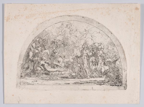 Adolphe Alexandre Dillens created this print, depicting a group of men and women fighting at a well, using etching, a printmaking technique that dates back to the Middle Ages. The incised lines, created by acid biting into a metal plate, allowed Dillens to capture a dynamic scene with rich detail. This printmaking method would have allowed for multiples, making the artwork more accessible to a wider audience. This etching would have required a skilled artisan to prepare the plate, apply the acid, and carefully control the biting process to achieve the desired depth and tone. The subject matter, a chaotic scene of conflict at a water source, contrasts with the refined technique of etching. Water was a precious resource and a site of labor, particularly for women. The struggle depicted here reflects the competition for essential resources and the tensions of everyday life in a rapidly changing society. By examining the materials, making, and context of this print, we gain a deeper understanding of its cultural significance and the complex interplay between art, labor, and social dynamics in 19th-century Europe.