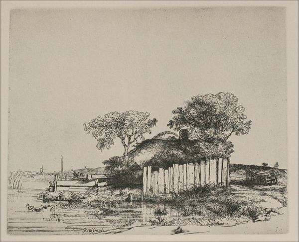 Curator: Here we have "A Bathhouse at Liselund on Møn," created by Søren L. Lange in 1805. It's an etching and ink drawing depicting a serene landscape. Editor: It's quite tranquil, isn’t it? A certain… fragile beauty about the whole scene. The lines are so delicate, the tonal range rather limited... it’s very picturesque. Curator: Absolutely. Now, consider this within its historical context: Romanticism was burgeoning, valuing subjective experience and the sublime power of nature. This piece reflects those sensibilities, particularly within the framework of class and access. The landscape as something both to behold and to exploit. Editor: It's the bathhouse itself I keep coming back to, its physical construction. Look at how it contrasts with the nature surrounding it: the simple brickwork, the way the thatched roof was probably produced… What labour went into making such a relatively humble structure a place of leisure for wealthy patrons? Curator: A keen observation. Liselund was indeed an estate, and this bathhouse, while seemingly simple, speaks volumes about leisure and privilege. Think of the power dynamics at play. The aesthetic enjoyment of this constructed landscape relies on those very materials and the work that provided it. It even brings to mind questions of who had access to such refined personal hygiene, in a time with limited access to clean, potable water. Editor: Exactly. Even the composition feels intentional. The bathhouse is neatly framed, carefully situated between natural resources, and human construction of the space. Curator: And consider the symbolic weight. Water, often linked to purification and rebirth, features prominently with the waterfall at the front left of the scene. The social connotations within these serene spaces… the ways it’s tied to gender and to hygiene, creating these new social distinctions in the Danish Golden Age. Editor: By foregrounding these things, perhaps Lange invites us to see how social and physical landscapes co-exist and define each other. I think too often such images are viewed only through a superficial idea of idyllic landscapes. Curator: I agree. And bringing those themes forward, we can challenge how we understand Romanticism, especially concerning social inequities of the early 19th century. Editor: Examining materials, manufacture, labor, and its place within a romanticized landscape... It enriches the reading. Curator: Precisely, and in so doing we expand art history beyond aesthetic appreciation and situate it within power and class analysis.