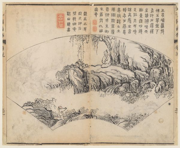 Editor: This is "Album Leaf and Two Text Leaves," an ink drawing by Wang Chen from 1774. It has this dreamlike quality to it, almost like a memory fading. What do you see in this piece? Curator: I see a layered exploration of power, tradition, and artistic identity. The landscape, while beautiful, is also a constructed ideal, reflecting the values of the literati class in 18th-century China. Wang Chen isn't simply depicting a landscape; he's engaging with a long history of landscape painting, referencing artistic traditions while subtly questioning their relevance to his own time. How do you read the inclusion of the text leaves? Editor: I guess I saw them more as decoration, adding another layer of visual interest. Curator: But what do those textual layers *mean* in relation to the landscape itself? Are they reinforcing the values represented by the landscape, or are they offering a critique? Think about the social hierarchy, who had access to literacy, to art patronage, and how that impacts our understanding. Does Wang Chen subvert the traditional symbolism, perhaps commenting on his own position within that system? How can we, as contemporary viewers, confront our own assumptions about idealized landscapes and artistic skill? Editor: So, it's less about just seeing a pretty picture and more about understanding its role in society and who it was made for? Curator: Exactly. This isn't just a serene landscape; it's a cultural artifact that encodes a specific worldview. To engage with it fully, we have to consider the power dynamics at play, then and now. Editor: I never thought about it that way. It's amazing how much context changes how you see the whole piece. Curator: Indeed. Art is rarely made in a vacuum, and understanding its historical and social context is essential to unpacking its complexities.