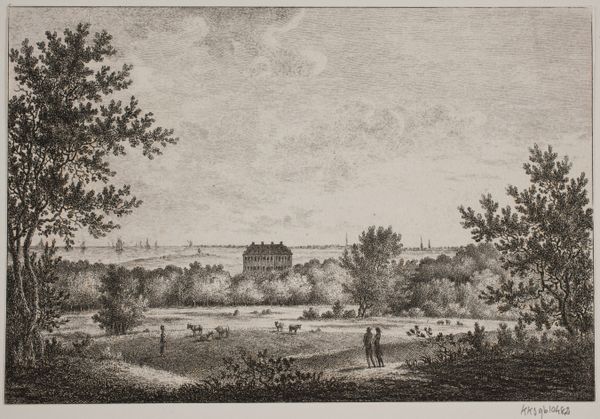 Curator: This is "Powderham Park, Exmouth," an engraving by E. Finden after Clarkson Stanfield. Stanfield, born in 1793, captured this scene, now held in the Tate collections, with such evocative detail. Editor: There’s a quiet stillness to it, a hazy calm. The light seems to linger, bathing the landscape in a soft, almost dreamlike quality. Curator: Absolutely. Stanfield was known for his mastery of light and atmosphere, and here, the way he renders the sky and the water reflects his skill. The composition, too, is noteworthy. Editor: I'm drawn to the figures in the foreground, seemingly paused in their labor. There’s a sense of life interwoven with the grandeur of the landscape. It makes me wonder about their stories. Curator: The foreground invites you in, doesn’t it? Consider the contrast between the pastoral scene in the foreground and the distant view of Exmouth. It's a deliberate juxtaposition. Editor: It all pulls together, doesn’t it? This engraving has a gentle way of reminding us that every landscape has its own layered stories, both grand and intimate. Curator: Indeed. An evocative glimpse into another time.
