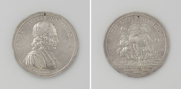 Curator: This intriguing metal engraving from 1669, created by Jan (I) Smeltzing, commemorates the "Death of Johannes Coccejus, Professor in Leiden." The Baroque style is apparent. Editor: It’s austere, isn’t it? The monochromatic metal feels cold, yet the detail in the engraving is impressive, almost obsessively rendered. There's a pronounced gravity. Curator: Absolutely. We can consider this piece through the lens of 17th-century Dutch society and the important role of theology and scholarship. Commemorative medals such as this one often served as symbols of status, memory, and the public recognition of significant figures. The front depicts a solemn portrait, but note the imagery on the reverse. Editor: The open book wreathed in clouds is compelling. I am drawn to the craftsmanship of this engraving, the fineness of the lines, and the time that must have been invested in this piece. We see the dove in the sky overhead. Who was Smeltzing and how did his workshop operate? Where would he source the metal? And, given the context, might he have specialized in religious subjects? Curator: Good questions. The open book, often associated with scripture, is shown ascending towards the heavens signified by that very dove of the Holy Spirit—so Smeltzing very clearly worked under very well established iconographic tropes of the day. This wasn't just an aesthetic object, but one deeply enmeshed with prevailing belief systems, used to uphold theological institutions and immortalize its prominent leaders like Coccejus. We must remember Leiden was a real hub of not just artistic production but also centers of academic learning at that moment. Editor: I appreciate how unpacking this piece requires us to think about both the specific techniques of metal engraving and the larger systems of power at play, and its religious context too. It really throws light on artistic labor back in the 17th century and the market that arose for that craft, at all. Curator: Indeed. Examining it reveals a rich tapestry of artistic process and cultural meaning—one that can reshape our understanding of religious life, portraiture and politics in the Dutch Golden Age. Editor: And in doing so, the role metal craftwork had in preserving it!