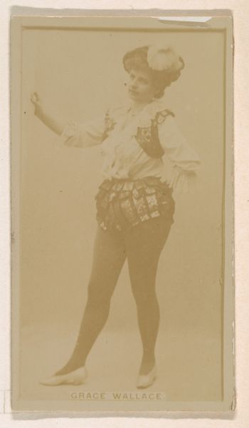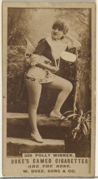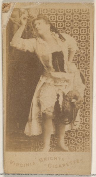 Editor: So, this photograph is entitled "Mlle Naya, from the Actresses series," dating back to 1890. It was produced by Kinney Brothers to promote Sweet Caporal Cigarettes! She’s quite striking, almost otherworldly, with the horn. What does this image evoke in you? Curator: Ah, Mlle Naya! To me, she whispers of fin-de-siècle theatricality and commercial ambition, intertwined in this pocket-sized photograph. Do you see how the sepia tone lends a vintage aura, and how, counterintuitively, the advertisement is not really about cigarettes but about image, about spectacle? The single horn sprouting from her head reminds me a little bit of unicorns but even more, I’m wondering if there's a reference to theatrical depictions of devils or mythological figures? Editor: That's fascinating. I hadn't considered the theatrical aspect beyond just a performer being photographed. The horn seemed like a simple costume element to me. Curator: Perhaps, but let’s not underestimate the power of the stage in the late 19th century. Consider her raised hand – she’s gesturing, maybe enticing us into the smoke-filled world of the theater…or, well, encouraging us to buy cigarettes? The beauty of it all is the gentle merging of the world, so real, yet touched by fantasy and industrial goals. And think of the dreams woven for the audience of these little pictures... do you catch that echo? Editor: I do, especially imagining someone collecting these. What a world of imagery and aspiration in a little collection. The photograph being on a card too seems like a commentary in itself! It gives a real tangible essence to it. Curator: Indeed! So many interpretations. Thanks for sharing this with me, and hopefully others too.