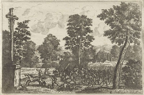 Willem de Heusch created this etching, “Landscape with Two Oxen,” sometime in the 17th century. Notice how the composition draws you into a serene pastoral scene. A winding path guides your eye through the landscape. This path leads to a distant horizon, punctuated by soft, atmospheric clouds. The meticulous etching technique creates a play of light and shadow, defining forms and textures. The trees, rendered with delicate lines, frame the composition, adding depth and structure. See the contrast between the detailed foreground and the more loosely rendered background? This contrast enhances the sense of space and invites contemplation. The arrangement of elements suggests a structural framework, perhaps echoing the 17th-century interest in order and harmony. The presence of the oxen and herdsman adds a narrative element, humanising the landscape. Yet, the overall effect is one of structured calm, inviting us to reflect on the relationship between nature and human presence.