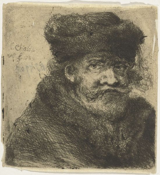 Editor: Here we have Jan Chalon's "Man met hoed," created between 1748 and 1795, an etching on paper. It feels incredibly intimate, like we're catching a private moment with this person from another time. What captures your attention most in this portrait? Curator: It’s funny you say “intimate," because the first thing that strikes me is this frantic energy in the lines. Like the artist was trying to capture something fleeting, an idea or impression, before it vanished. Did Jan Chalon labor to record this man, or just dash this portrait off to catch another appointment? Look how those hurried scribbles both define form and seem to almost dissolve it. It makes me think – what IS this man thinking? Is he even really present? It's a fascinating dance between presence and absence, wouldn't you agree? Editor: Absolutely, I see what you mean. The hat especially, it almost melts into the background, like a thought half-formed. It makes you wonder, was Chalon more interested in the inner world of his subject than just his physical appearance? Curator: Precisely! And think about it—etching, it’s not the easiest medium to express pure emotion with. It can be unforgiving. Yet here, it almost feels like we're seeing the man’s aura. Don’t you find it strangely evocative for something so seemingly simple? Editor: I do. It's making me rethink my initial impression of it being just a portrait; there's definitely something more complex going on. Curator: Exactly. Art often rewards that second, deeper look. Sometimes, the beauty lies not just in what is presented, but in what it whispers to your soul, doesn't it? Editor: Definitely. I'll never look at a simple etching the same way again! Curator: Nor will I, friend, nor will I.