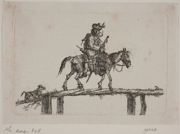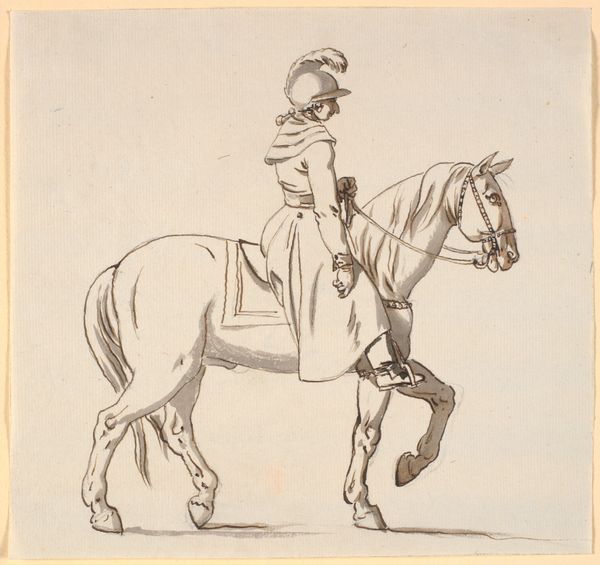 Editor: Here we have Martinus Rørbye's 1830 pencil drawing, "Hestetrukken slæde med en mand på et knippe rør [?]," or "Horse-drawn sleigh with a man on a bundle of reeds [?]." There's a certain quiet simplicity to it, almost melancholic. What captures your attention about this drawing? Curator: The work evokes a Romantic era fascination with rural life and the changing social landscape of 19th-century Denmark. Rørbye presents a vignette of everyday labor, but within it lies a potential commentary on social class and the means of survival. How is the man presented in relation to the horse and his task? Editor: The man seems relaxed, even detached, almost a passenger. Perhaps he's simply overseeing the transport? Is it an idealization of labor, or something more nuanced? Curator: That's an important consideration. Romanticism often idealized rural life, but Rørbye might be hinting at the realities of that existence. Note the somewhat rough quality of the lines. It's not polished or overly romanticized, perhaps indicating the subject’s social standing, or commenting on a kind of pre-industrial society. Editor: So, the very act of depicting this scene, using this style, is a statement about the public’s perception and acceptance of such subject matter. Curator: Precisely. The choice to elevate such an ordinary scene suggests a shift in what was considered worthy of artistic attention and public viewing. It speaks to a growing interest in depicting the lives of everyday people and their role in shaping the national identity. Editor: I see. So it’s not just a quaint winter scene; it's a reflection of societal values. I didn't expect so much complexity from what appeared to be a simple sketch. Curator: That’s the power of historical context! Art rarely exists in a vacuum. We bring our contemporary perspective, but art speaks to a broader societal conversation when understood in its context.