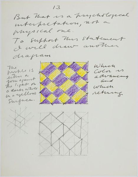 Editor: Here we have Stuart Davis' "Color Diagram". It's undated, but it lives here at Harvard Art Museums. It feels almost like a secret code. What symbolic layers can you unpack here? Curator: Notice the inscription, "A color is drawing, drawing is subject." Davis seems to be collapsing hierarchies. Do you see the emotional implications of equating color and drawing in this way, almost like an alchemical formula? Editor: I see that, it reminds me that artists can use any medium to represent their vision. Curator: Precisely! And the sequence, black to white, blue, red, green—what cycles of transformation might that suggest to you? It is almost ritualistic! Editor: The cyclical nature is intriguing. It underscores how artistic expression is ongoing, a process rather than a fixed entity. Curator: Exactly! It's about continuous visual language, always in flux. Editor: I’ve never thought of visual language this way before. Thanks for sharing your perspective.