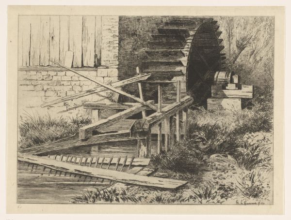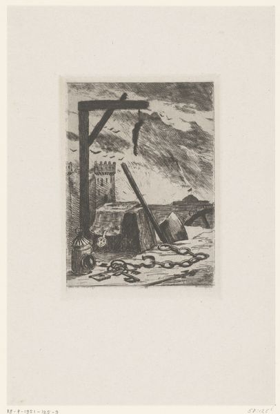Carel Nicolaas Storm van 's-Gravesande made this etching, ‘Returning Fishermen,’ capturing a group of figures descending a wooden structure, their spears suggesting a day’s labor. The descent motif echoes through art history, resonating with images of the Fall, or of figures returning from sacred or transformative experiences. Notice how the figures’ bent postures and weary steps mirror the universal experience of returning to the everyday after a period of intense activity. This descent is not merely physical; it’s a symbolic passage back to the mundane, weighed down with the day’s experiences. Consider the spears, their pointed ends cutting through space. Similar weapons appear in ancient depictions of hunters, and warriors. These are symbols of survival and conflict, but here they represent a more personal struggle—the daily battle against the elements, the constant effort to provide, the relentless cycle of labor. The image is sparse, yet charged with the psychological weight of human endurance, a recurring theme in our collective memory.
