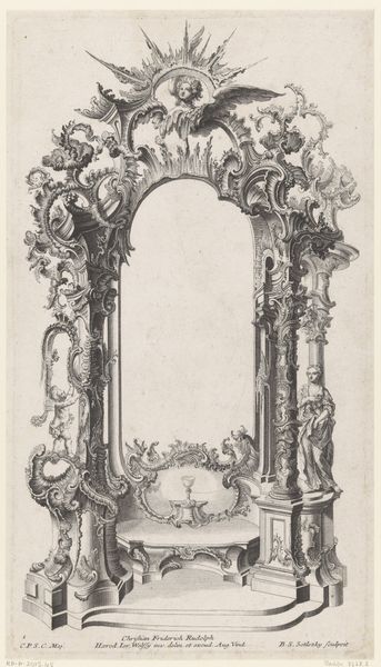 Curator: I’m immediately struck by the dynamism of the lines; that swirling ornamentation almost seems to defy the static nature of engraving. Editor: It's fascinating, isn't it? This engraving, titled "Schouw met putti," or "Mantelpiece with putti," was created by Johann Esaias Nilson between 1731 and 1788. You can see it here at the Rijksmuseum. Curator: Nilson's Baroque style shines. Those chubby cherubs, or putti, framing the mantelpiece—each seems to embody a different aspect of jovial abundance. They suggest warmth and vitality. It is definitely aiming for a celebration of hearth and home, a comforting iconography. Editor: Exactly! Notice how the grapevine motifs add another layer to the theme of plenty, traditionally referencing classical imagery around the changing of seasons. Curator: The interplay between light and shadow created by the engraving technique further enhances this feeling of depth, wouldn’t you agree? The swirling lines accentuate the dynamic movement inherent to Baroque designs. Even in two dimensions, there's a theatrical element at play. Editor: A deliberate strategy. See how that centralized light emphasizes the symmetry—that mirrored ornamentation almost demands a philosophical investigation of form, how the cherubic figures bookend and highlight a larger whole that invites readings beyond the purely ornamental. What thoughts emerge for you, pondering this object? Curator: Thinking about the domestic settings where such images would circulate... I wonder if they unconsciously contributed to idealizing—if not actively engineering—particular emotional or symbolic associations tied to home. This puts emphasis back on fire and the role of the hearth, tying back into classical concepts of time. Editor: A powerful reflection. And ultimately, in dissecting this visually dense scene, the brilliance of Johann Esaias Nilson shines anew. Curator: Indeed, viewing it now encourages considering continuities linking aesthetic conventions, and psychological impacts from centuries prior to today's homes.