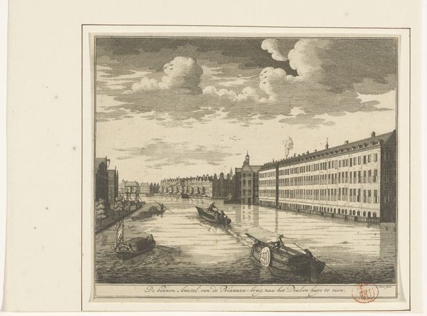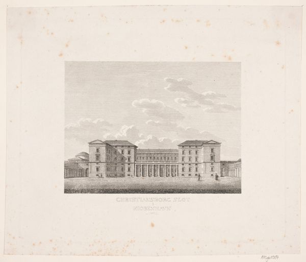 Curator: Before us we have François Louis Couché's "Gezicht op het Place des Vosges te Parijs" from 1818, currently held at the Rijksmuseum. The artwork utilizes etching and engraving on paper. Editor: It has such a severe, symmetrical layout, like a stage set for some rigid societal ritual. I find the rigid geometric construction, the austerity, quite imposing. Curator: Yes, the rigid composition reflects the prevailing Neoclassical aesthetics of the time. One should consider, however, how the print medium itself impacted production, making such scenes of urban grandeur accessible to a wider, consuming public beyond the aristocratic circles traditionally depicted. It is, at heart, a mass-produced item showing an aristocratic symbol. Editor: Mass-produced, certainly, yet look at the precision of those lines! Note the delicate hatching and cross-hatching that define the buildings and create a sense of depth, while offering some nuanced tones. I find it so precise, which amplifies its order and stoicism. Curator: Precisely! And it is crucial to note that such visual perfection demands incredible artisanal labor and highly specialized knowledge that would certainly be outside the lifestyles of many of its consumers. This artwork, therefore, participates in the societal forces of both democratization of knowledge, in tandem with the elitism inherent to art production. Editor: You highlight an interesting paradox. I, for one, remain fixated on the stark contrast between the solid architectural forms and the atmospheric sky. Those soft cloud forms mitigate the unyielding formality, offering the eye a point of release. The linear rigor versus organic form serves a striking aesthetic purpose. Curator: Viewing it from the vantage of accessible art, it served to cement an aspirational vision in the burgeoning bourgeoisie, of course. But the level of human effort and expense that engraving processes involved shouldn’t be discounted. It highlights social inequalities, even if it tries to give an illusion of uniformity, mirroring what happened in France and Europe at the time. Editor: An utterly fascinating discussion, wouldn’t you agree? A print, yes, but one deeply infused with visual drama and loaded symbolism. Curator: Indeed, prompting a needed understanding of both the artwork's context and its position as a crafted object amid the societal flux of its day.