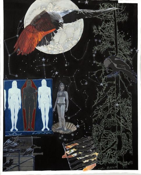 Editor: Here we have Joseph Cornell’s *Habitat Group for a Shooting Gallery,* from 1943, a mixed-media assemblage in a box. It has such a whimsical, yet melancholy feel to it. The antique bird images are really evocative. How do you interpret this work? Curator: For me, this piece reverberates with cultural memory and hidden narratives. The birds themselves, fragmented and numbered like specimens, evoke a sense of loss, a displaced paradise perhaps. Consider the 'shooting gallery' in the title – it implies a game, but also violence, a threat to these fragile creatures. Cornell was deeply affected by personal anxieties and global events, specifically war. Editor: That's interesting, I was focused on the colourful birds, not their fragility. The numbered tags...are those significant? Curator: Yes, the tags and printed ephemera layered within the box—hints of Parisian commerce and exotic locales—are like clues scattered across time. They represent the romantic allure of travel, but also the cold precision of categorization, of control. The collage background feels very distant and artificial. Do you notice the way he creates a world within a world? Editor: Absolutely, a stage set almost, for something bittersweet. So, it's a commentary on longing and maybe the precarity of beauty? Curator: Precisely. It makes me think about lost paradises or fleeting moments. Consider that even our fascination, our human impulse to possess or to categorize can actually harm what we admire. What’s your sense now, looking again? Editor: I see it! Before I saw a cute box, but now the layered textures make it seem deeper. More like a commentary on both human intervention and cultural displacement of nature itself. Cornell really loaded this box with meaning!
