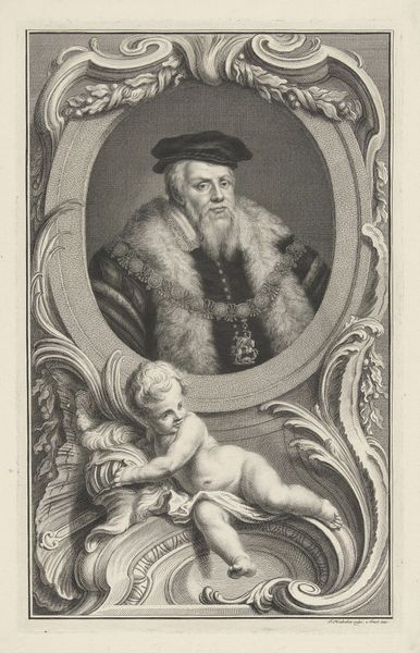 This is Jacob Houbraken’s engraving “Portretten van Dirck en Wouter Pietersz. Crabeth”, made sometime between 1698 and 1780. It captures the likenesses of two 16th-century brothers, Dirck and Wouter, both accomplished glass painters from Gouda. The composition layers their identities; Dirck is sketched in the background above Wouter’s formal, framed portrait. Symbols of their craft surround them: a cherubic figure, a bull, and a painter's palette hint at their artistic legacy. Houbraken, working in the Dutch Golden Age, revives the Crabeth brothers' memory, embedding them in a lineage of Dutch artistic achievement. This engraving isn't just a record of their faces; it’s a statement about cultural memory and artistic identity. The Crabeth brothers aren't merely artists, they are patriarchs of a cultural heritage carefully curated and proudly displayed. Houbraken invites us to reflect on how we construct and commemorate our cultural heroes.