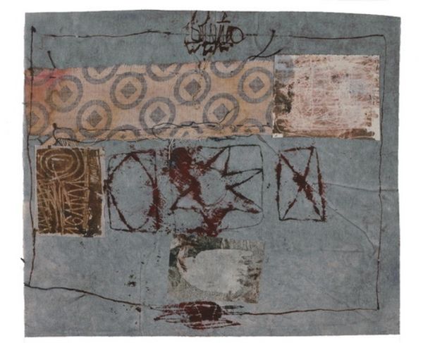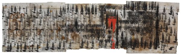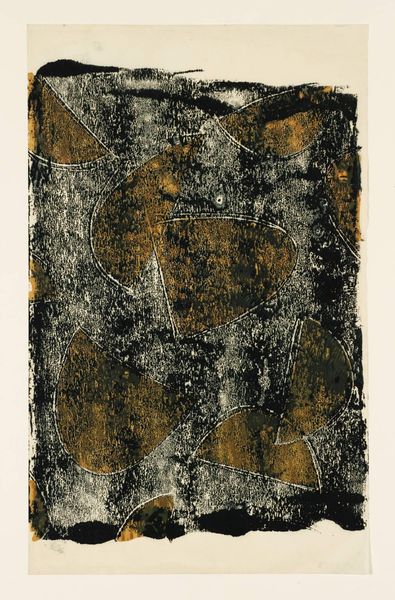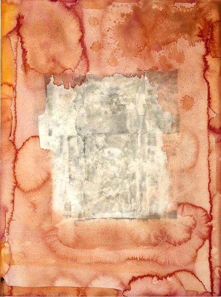 Editor: Here we have Irwin Kremen's "La Bruyère VI (for Merce Cunningham)," created in 1976 using mixed-media collage. It has a definite worn feeling to it, almost archaeological. What do you see in this piece? Curator: The layered surfaces and fragmented texts draw my attention to the role of art as a carrier of cultural memory. Kremen, deeply engaged in the artistic communities of his time, dedicated this work to Merce Cunningham, a hugely influential figure in modern dance. Considering their collaborative milieu, could this collage reflect the ephemeral nature of dance itself, preserved through fragments and recollections? Editor: That’s interesting! So the tears and rips… Curator: Precisely! Think of the tearing and layering as a metaphor for the passage of time, and for how Cunningham’s choreography, so radical at the time, impacted and reconfigured the established forms. The visual layering invites viewers to consider how social and artistic movements shape the collective consciousness. It also highlights the institutional practices that acknowledge, interpret, and preserve artistic expressions. Do you think Kremen aimed to challenge traditional notions of artistic permanence? Editor: Definitely, and the found elements – the scraps of text and aged paper – speak to that impermanence, too. Using matter painting almost turns these discards into treasured objects. Curator: Precisely! Kremen elevates discarded ephemera to art, blurring the lines between high and low culture, reflecting how art itself could redefine its own space in culture through repurposing overlooked material and imagery. Considering this artwork's role as a tribute within the vibrant artistic community of its era makes one consider the sociopolitical and art worlds these artists inhabited. What do you make of the green? Editor: Now that you mention it, the overwhelming amount of muted, aged green perhaps evokes a certain sense of nostalgia, reflecting a bygone artistic era. Curator: Precisely! These works serve as reminders that artists often act as barometers of social change and witnesses to history, capturing and critiquing through creative exploration. Editor: I’ll never look at collage the same way! Thanks for that lens.