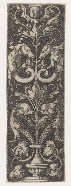 Editor: Here we have a print titled "Hilt of a sword, decorated with white arabesques on a black background", dating roughly from 1516 to 1571. It's an engraving, depicting exactly what the title suggests. The stark contrast between the white lines and the black background is quite striking, but the abstract floral and geometric shapes seem slightly unnerving somehow. How do you interpret this work? Curator: Focusing on the formal aspects, the piece presents a fascinating interplay of positive and negative space. Note how the white arabesques, seemingly floating on the black ground, define the contours of the sword hilt, achieving clarity. The linear quality created by the engraving technique reinforces a sense of precision and control. Editor: I see that, yes. It’s carefully made, but how would you address the repetition of these design elements? The curves and flourishes feel somewhat relentless. Curator: The repetition contributes to an overall visual rhythm. Observe the mirroring effect down the center, which lends symmetry, giving a balanced feeling. In what way does it communicate an unsettling quality? Editor: Perhaps because that very rigid structure constrains any sense of natural growth or movement. All those shapes locked within such a hard, unyielding form. Curator: An insightful observation. Considering your point, could we suggest this contrast reflects a larger dialectic perhaps – order versus chaos? Life versus death? Editor: Yes, I see that tension now. The controlled ornamentation clashing against the purpose it serves – protection in violent acts. Thank you for pointing that out! Curator: Of course. Examining the elements and composition often brings unexpected layers of understanding.