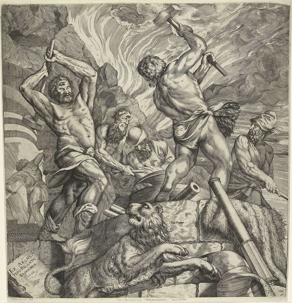 Elias van den Bossche's "Crucifixion of Christ," rendered in ink, presents a somber scene, its composition dominated by the stark contrast between the turbulent sky and the struggling figures below. The artist employs a dense network of lines to sculpt forms and convey a sense of weighty drama. The diagonal thrust of the cross cuts across the vertical bodies, creating a dynamic imbalance that unsettles the viewer. Look at the visual tension here, where the meticulous rendering of muscles contrasts sharply with the coarse texture of the sky, embodying the conflict between human suffering and divine indifference. The use of light and shadow not only models the figures but also accentuates the emotional weight of the moment. This print invites us to consider how an artist uses formal elements to engage with profound philosophical and existential themes.