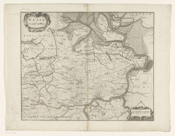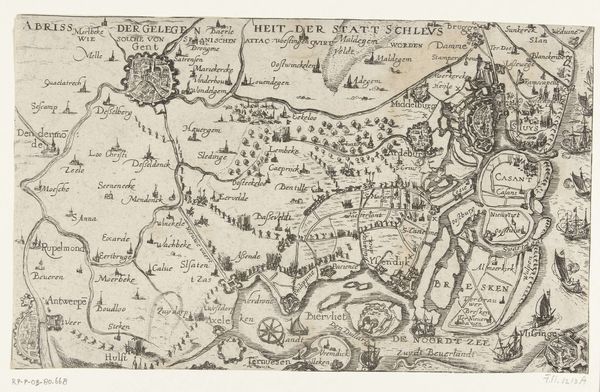 Curator: Welcome. We're looking at a 1624 print titled "Inval van Hendrik van den Bergh in de Veluwe (kopie)," whose authorship remains anonymous. It's currently held in the Rijksmuseum. Editor: My first thought is, "What an incredibly busy composition!" The dense lines create a visual sense of almost overwhelming detail and activity. It has a strange, austere beauty to it. Curator: Indeed. The artist utilizes engraving, ink, and printmaking techniques to render what seems to be both a map and a genre scene, a collision of purposes that defines its unique style. Let's unpack some of the key motifs here. Editor: We immediately notice it depicts Hendrik van den Bergh's incursion into the Veluwe region. It speaks to Dutch resistance against Spanish occupation, reflecting a critical juncture in the Eighty Years' War. The image blends a military campaign narrative with contemporary mapping conventions, underlining power and territory during the era. Curator: Yes, the overlay of cartographic elements with miniature figural representations offers insight into the structural order the artist aims to impose. Consider the geometry inherent in the map itself versus the seemingly chaotic dispersion of figures in the scene below. Editor: Precisely! It's a negotiation between objective mapping and the chaotic realities of warfare, mirroring similar tensions across gender, class, and the political spectrum, during this time period. It offers interesting insights into national identity formation. Curator: Focusing on formal analysis, we see how linear perspective functions symbolically here, flattening pictorial space while simultaneously constructing a narrative of invasion and territorial acquisition. Notice also the contrasting texture from the highly detailed foreground versus the stylized representations of land. Editor: I can agree. It’s fascinating to see history painting intertwined with genre elements, giving voice to military history—depicting the strategies of territory. It reminds me to question, as it offers space for whom to assert themselves? Curator: It encourages an appreciation of how even seemingly simple prints reveal complex relationships between art and historical events. Editor: And reminds us that artworks are not silent witnesses but active participants in shaping our understanding of our past, of class and of cultural and territorial belonging.