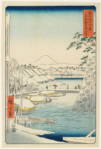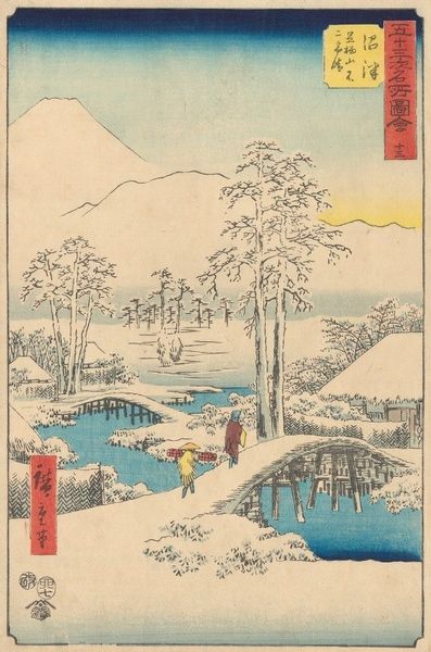 Editor: This is Utagawa Hiroshige’s “Mount Haruna in Snow,” possibly created between 1853 and 1858. It's a woodblock print, a medium I always find fascinating. There's a sense of quiet isolation to this image; it's beautiful, but also makes me think about the labor that went into making this. What jumps out at you about it? Curator: What strikes me is how Hiroshige mediates our experience of the mountain. Think about the labor involved – the carving of the woodblocks, the precise registration of color. Each line, each plane, a product of skilled craft. Does this elevation of craft challenge traditional hierarchies of art, in your opinion? Editor: Definitely. The meticulous carving required subverts any simple separation of “art” and “craft.” It makes me think about the social context of the work - were the craftsmen viewed differently from the artist himself? Curator: That’s precisely the question. Woodblock printing in the Ukiyo-e tradition involved a division of labor: the artist, the carver, the printer, all contributing to the final product. The economic system propped it up. Consider the demand for these prints and how it fueled this mode of artistic production. This wasn't art made in a vacuum; it was responding to market demands, impacting consumption. Editor: So, the image isn’t just depicting a snowy mountain; it’s evidence of a whole production system and consumer culture. The beautiful scenery becomes a kind of commodity. Curator: Exactly. And what about the consumption of the materials, where did that timber come from? Whose labor was involved in the sourcing and processing? Can a landscape be innocent of economic influence? Editor: Wow, I hadn't thought of it that way. Now I see so many layers of production that are literally beneath the surface. It's not just a picture, but a material artifact tied to a specific place and time. Curator: Precisely! It’s in understanding the means of its production and the social conditions that made it possible, we enrich our interpretation.