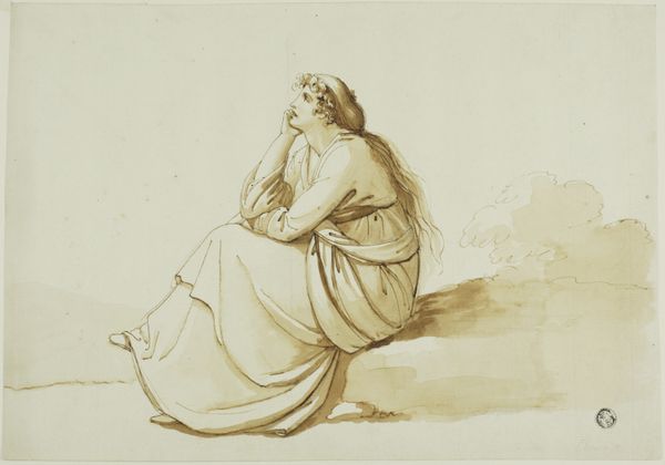 Curator: This drawing, entitled "Zittend boerenmeisje," or "Seated Peasant Girl," was created using pencil in 1824 by Arnoldus Johannes Eymer. I find it striking for its simultaneous capture of realism and romanticism. Editor: My initial reaction is one of quiet contemplation. There's a gentle wistfulness in her gaze. It is amazing that just a simple drawing using pencil strokes can evoke such depth and character. What do you find significant about the work’s historical context? Curator: Well, Eymer worked during a time of considerable social change in Europe, even unrest. The art world saw the rise of Realism alongside Romanticism, each responding to the Industrial Revolution in very different ways. Eymer seems to navigate both—he acknowledges the "real," everyday laboring class through his subject, yet idealizes the girl by means of a classical, almost idealized rendering. Editor: It’s interesting to me that you say idealizes, because while she is depicted with some softness, her bare feet and posture suggest a kind of groundedness that speaks to her lived reality, rather than an idealized fantasy of rural life. Her gaze draws me—there's something so knowing and subtly challenging in her glance away from us. It resists easy consumption or idealization, at least for me. Curator: That's a fair point. I think my immediate read leans into art history, and the prevailing trends of idealizing peasantry. But her direct gaze certainly pushes back against that. Eymer's composition certainly contributes. He's not shying away from the texture and physicality of her labor. Her placement on what looks like a large stone, a potential building block or boundary marker, also seems very deliberate to me, creating this sense of a firm, anchored existence. Editor: Precisely! And, beyond its formal composition, I keep thinking about the role and the agency of women, especially rural working women. To have them viewed as central subjects is an incredible moment in this period. Where art became interested in what previously had been under the radar or unnoticed altogether, it opens new interpretations in relation to history. Curator: Indeed. Eymer gives voice to this previously unacknowledged or even overlooked sector of the population in this quietly profound sketch. It speaks volumes to social identity at the time. Editor: Absolutely. A reminder that the narratives we create, and that museums display, must actively question and engage the absences and presences that artworks reveal in the social, political, and personal landscapes.