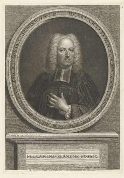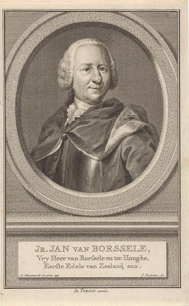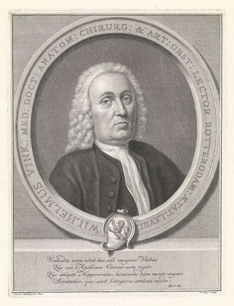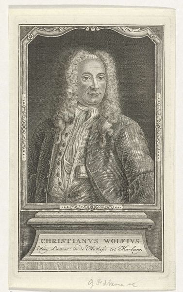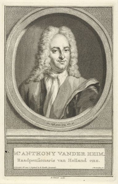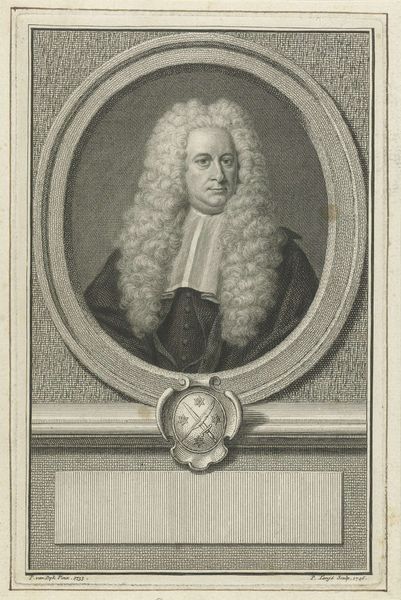 Editor: This is a print, an engraving really, of Sicco van Goslinga by Jacob Houbraken, dating somewhere between 1708 and 1780. The detail is amazing! It feels almost like a photograph in its clarity, especially the texture of his wig and the armor. How should we interpret portraits like this from a historical perspective? Curator: Well, beyond the artistry, such portraits served a critical social function. Consider, what does this image tell us about power structures of the time? Van Goslinga was a significant political figure. The armor might indicate military prowess or simply a connection to established power structures, designed to project authority and status. It speaks to how elites wished to be seen and remembered. Editor: So it's less about his individual personality and more about his role in society? Curator: Precisely! The portrait becomes a tool of self-representation within a specific political and social landscape. Who commissioned it and for what purpose are key questions. Was it for family, public display, or part of a series? These prints often circulated, spreading the sitter’s image and reinforcing their status among a wider audience. How do you think the relatively accessible medium of print affects the impact? Editor: That’s fascinating. Making multiple copies means more people could see it, almost like early political propaganda, then. The impact goes beyond just memorializing the individual. Curator: Exactly. Understanding that expands how we interpret this image, and its function. Instead of solely focusing on individual aesthetics or artistic skill, we begin to see how portraits actively participated in constructing and maintaining social hierarchies. Editor: This has really opened my eyes to a different way of looking at portraits. I will never see portraits as a snapshot of time again, and more about their significance in societal power. Curator: Indeed, considering the social and political context reveals a richer understanding of the portrait’s intended message.