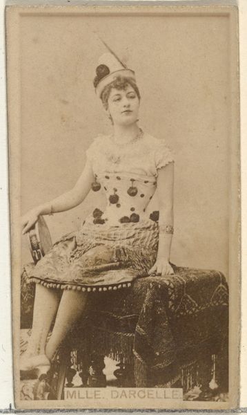 Curator: Let’s turn our attention to this small but fascinating portrait, a trade card produced by Goodwin & Company sometime between 1886 and 1890. It depicts the actress Ada Rehan. Editor: Ah, it’s got that sepia-toned dreaminess of old photos. She’s gazing off somewhere, almost ethereal, leaning slightly on what looks like a heavily ornamented table with a candelabra on it. It makes me think of old theatres, velvet curtains, and whispered secrets. Curator: Indeed. These cards, part of the “Actors and Actresses” series, were actually marketing tools tucked into packs of Gypsy Queen Cigarettes. Consider the layers: a commodity object, cigarettes, advertising another commodity, celebrity. It reveals much about late 19th-century popular culture and the commercialization of fame. Editor: It's funny to think about celebrity then and now, and how ephemeral fame can be! I imagine people collected these like trading cards, images of their favorite stars packaged with something completely unrelated—cigarettes! I'd almost forgotten about objects such as tobacco cards; what happened to them? Curator: Many ended up in scrapbooks, tossed aside, or were destroyed. What survives offers clues to what images were in circulation at the time, whose likeness was prized, and which companies found value in that recognition. And of course the printing technology—photoengraving which helped democratize image production and dissemination—deserves consideration. Editor: It's that element of mass production juxtaposed with Ada's striking, albeit captured, presence in a still image that strikes me the most. To think she unknowingly sold who-knows-how-many cigarette packs by virtue of a celebrity portrait; quite an unexpected form of consumerist idolatry, if you ask me. Curator: Precisely. Thinking about those consumers, the laborers making cigarettes, the photographers capturing portraits like this of Ada Rehan, makes you reflect on this artifact as more than just a portrait but the manifestation of many industries meeting simultaneously. Editor: In retrospect, it reminds me to reflect on how intertwined our lives and arts, even seemingly delicate arts such as portrait photography, become in conjunction with industry.