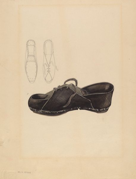 Curator: Here we have "Man's Shoe," a drawing made circa 1936. It seems to be rendered in pencil on toned paper. Editor: It's remarkably gentle, almost melancholic. A worn shoe, sketched with such care. It makes you wonder about the man who wore it. Curator: Absolutely. There’s something intensely personal about a shoe, isn't there? I get the feeling this was a page in a sketchbook; note the less defined shoe outlines drawn up above, offering alternative views as experiments, and further down a finely worked finished object. One worn constantly. Look at the details the artist captures—the subtle gradations of tone achieved with careful shading, and a shoelace dangling from its eyelet. Editor: It certainly speaks volumes about labor and craft. Someone, somewhere, meticulously stitched that leather together, and another wore it until it softened and aged. It's like a material history lesson, almost a portrait of a working man embedded within this humble drawing. Do you know where the leather came from, what tannery tanned this to be what we see? Curator: Unfortunately, those details remain a mystery. But considering the time, it’s not unlikely these are Depression-era work boots. Perhaps the artist saw dignity in representing everyday objects used during difficult times. And who might have worn it, and to what purpose is another interesting consideration... A farmers boots worn to till, or a workers boots, maybe for industry. We don’t know. But we might never have otherwise looked twice at its material, design or story. Editor: You know, you're right. I tend to see the big picture but overlook the individual stitches, so to speak. This simple sketch has layers upon layers of human connection, from the maker to the wearer to the artist who observed and documented it. To what extent could we value a shoe so readily nowadays and how far removed are we from appreciating these historical representations of it? Curator: It is quite thought-provoking, isn't it? It prompts us to appreciate not only the beauty in the mundane, but also the intricate network of human lives connected through simple, everyday objects. Perhaps the next time I see a worn pair of shoes, I'll pause and consider the stories they could tell. Editor: And maybe I’ll trace the leather back to the tannery...