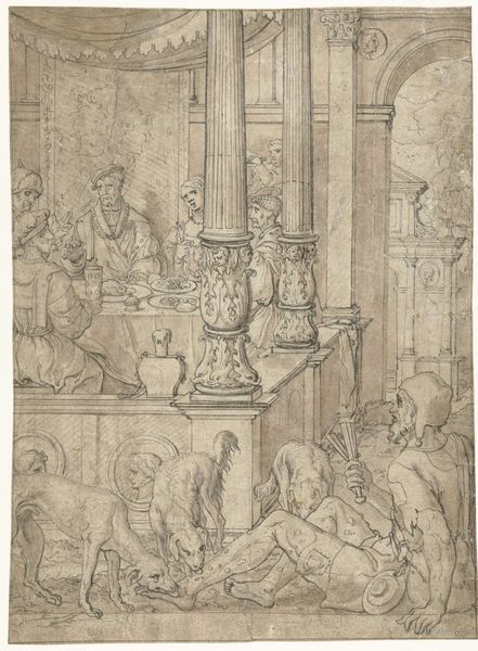 Editor: This drawing, "Allegorische voorstelling," created sometime between 1700 and 1749 by the Monogrammist WDW, uses ink, pencil and paper to create an allegorical scene. I'm immediately struck by how this image utilizes perspective, but I'm curious, what's your interpretation of it? Curator: Looking at this drawing, I'm drawn to the means of its production and the social context implied by the materials. The ink, pencil, and paper – relatively accessible materials – suggest a study or preparatory work. How might the artist’s use of readily available resources inform the creation of an "allegory," typically associated with high art and expensive media? Editor: That's interesting, I never considered the economics of art making! So, are you saying the chosen materials democratize the art or its message? Curator: Perhaps. It pushes us to question the boundaries between 'high' and 'low' art. The artist uses these basic materials to create a depiction of classical architecture and figures. Were drawings like these intended for wider consumption, maybe as designs for prints, thereby making allegorical imagery available to a broader audience? This shifts our focus from individual genius to a collaborative process of artistic production. Editor: So it becomes more about the circulation of ideas than the singular 'art object'? How does that relate to its allegorical nature? Curator: Exactly. And regarding the allegory, consider it within the social context. Allegories often served to legitimize power structures or comment on moral values. Think about who might have commissioned or used this image. What narratives were they trying to construct or reinforce? The choice of accessible materials may point to a strategic effort to disseminate specific messages more widely. Editor: This reframes my understanding. I always saw art as separate from its means of production. Curator: It’s crucial to recognize that the choices made in producing a piece reflect the intentions, resources, and the intended audience for it. Editor: Thinking about art in terms of material conditions offers a fresh viewpoint. Thanks!
