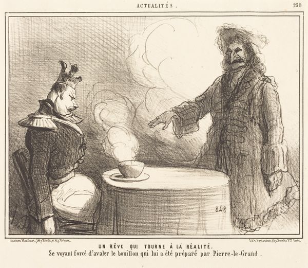 Honoré Daumier's lithograph, "D'ou arrives-tu?" presents a stark visual contrast, composed with a dramatic use of light and shadow to emphasize two figures in conversation. The composition is structured around the dialogue between two men. Daumier employs contrasting textures to distinguish them. The figure on the left, seemingly ravaged by the elements, is rendered with rough, erratic lines. The figure on the right, in stark contrast, is clean, smooth and in uniform. Daumier critiques the political climate through a semiotic lens. By using a semiotic system of signs, Daumier critiques the political climate. The disheveled figure may signify defeat and the illusion of glory. This use of visual language allows Daumier to subtly engage with and subvert the dominant ideologies of his time. This lithograph invites us to question the narratives of power. It encourages us to look beyond the surface.