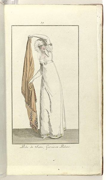 Editor: This is a print called "Elegantia, of tijdschrift van mode, luxe en smaak voor dames," from July 1807, a Neoclassical piece from an anonymous artist at the Rijksmuseum. The woman's pose with the shawl is very graceful. How can we interpret this as a symbol of its time? Curator: It's fascinating how fashion plates like these acted as a social mirror, reflecting and shaping ideals of femininity and class in the early 19th century. The figure embodies the Neoclassical taste for simplicity and elegance, drawing inspiration from ancient Greek and Roman styles. But beyond aesthetics, what societal values do you think this image is trying to promote? Editor: Perhaps, good taste, refinement, and… exclusivity? Fashion was definitely not accessible to all at this time. Curator: Precisely! The print appears in "Elegantia," a magazine title brimming with socio-cultural significance. How do you see that concept reflected in the overall composition? Consider the styling of the hair and the draping of the shawl as deliberate markers of status. Editor: The delicate watercolor illustration style and detailed rendering must have been desirable at that time. I wonder what that meant for the general public? Curator: Fashion was powerful back then, similar to how it functions now; these images shaped aspiration. And institutions like the magazine itself dictated trends and maintained existing class structures. It catered to a specific audience with both disposable income and a desire to assert their place in society. Editor: So it's not just about beautiful clothes but about participating in a particular vision of society. That gives the image a much greater significance than I initially perceived. Curator: Exactly. It’s a slice of life from a very specific segment of society, carefully constructed and curated for public consumption. Editor: That makes me think differently about fashion and art history, considering it from the social perspective rather than just aesthetics. Curator: That's a good point to have arrived at!