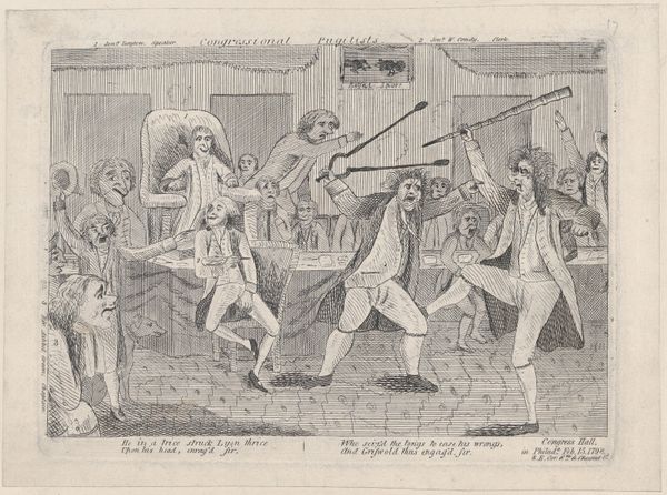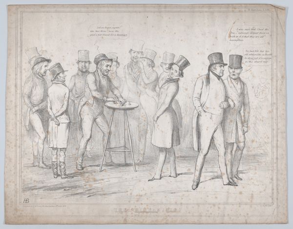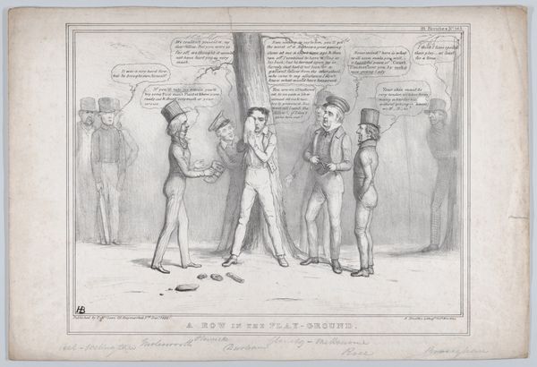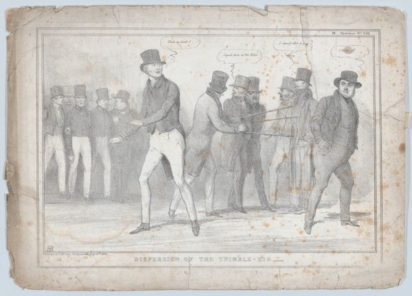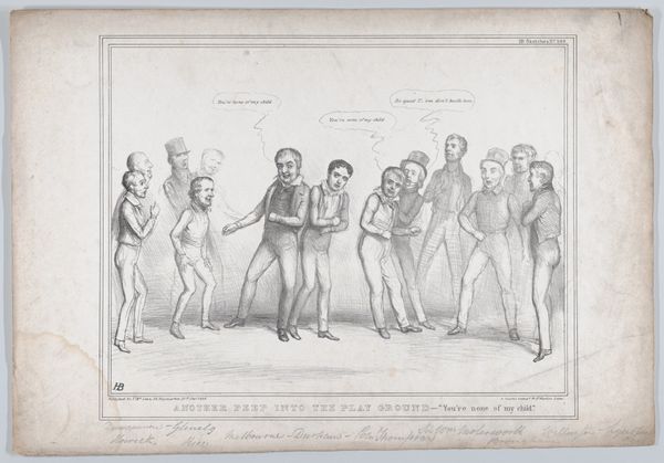 John Doyle created this lithograph, "A Leaf Out of Nicholas Nickleby with Slight Variations," in 19th-century Britain. It depicts a scene from Charles Dickens's novel, capturing Nicholas Nickleby's departure from Crummles's theatrical troupe. Doyle’s print offers insight into the cultural landscape of Victorian England, where literature and theater deeply influenced social life. The image reflects the popularity of serialized novels like Nickleby. Doyle worked as a political cartoonist for Punch magazine and, like many artists of his time, he understood the power of imagery to comment on social structures. The theatrical emotion of Mr. Vincent Crummles contrasts with the realities of the working world outside the stage. Doyle’s background allows us to examine the culture of celebrity and the commodification of art during the Industrial Revolution. The interpretation of this lithograph relies on an understanding of both literary and artistic contexts. Research into the social history of Victorian England enriches our understanding of art's meaning as contingent on its institutional context.