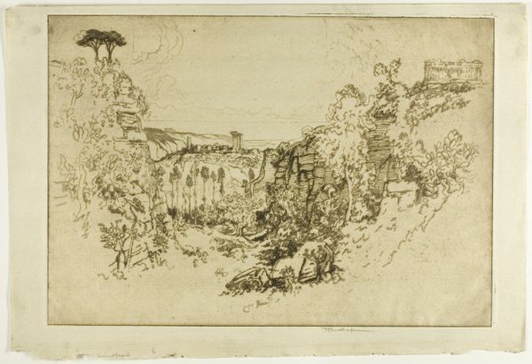 Editor: Here we have Joseph Pennell’s "Quarry on Pentelicon," created in 1913 using etching on paper. The landscape depicted seems stark, almost brutal in its depiction of the quarry. How do you interpret this work, especially given its historical context? Curator: Well, seeing this work, I immediately think about the historical tension between industrial progress and environmental degradation. Pennell created this etching during a period of intense industrial expansion, and I see it as a commentary on the exploitation of natural resources. Look at the harsh lines, the way the landscape is rendered almost barren. Do you see any indication of an actual environment or any hint of the people doing the quarrying, or any sign of labor, struggle, or equity? Editor: No, the quarry appears devoid of any human presence or activity. The focus is solely on the ravaged landscape. Curator: Exactly! By omitting human figures, Pennell highlights the sheer power of industry over nature. It makes me wonder, too, about whose hands benefited from the material extracted here. Are we looking at the extraction of resources to benefit local artisans or an extractive industry linked to colonialism, imperialism, or some other political movement? Consider how modernism, even in landscape, reflected anxieties about a rapidly changing world, especially around issues of sustainability and the rights of workers versus industrialists. Editor: So, you are saying the visual harshness is a deliberate choice to underscore the social and environmental impact? Curator: Precisely. It's an active statement about the cost of progress. He wants to make us ask important questions about that cost. Can economic prosperity really justify ecological destruction and potentially exploitative labor? It really asks us, What world are we making? What are we willing to sacrifice? Editor: That reframes the way I see it entirely. Thank you. Curator: My pleasure. It's in those complex contextual layers that art truly starts speaking to the current social landscape, which should inform everything.