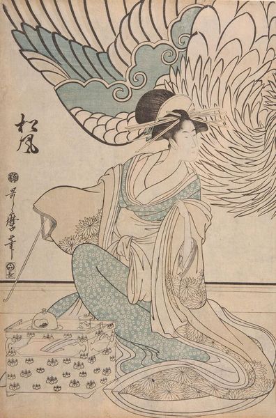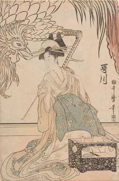 Curator: Kitagawa Utamaro's woodblock print, "Courtesan Nakagawa of the Matsubaya," from the Late Edo period, captures a moment of quiet introspection. My first impression? Melancholy elegance. The delicate lines and muted palette evoke a sense of longing, almost a sigh on paper. Editor: It's fascinating how Utamaro uses feathers—both as a decorative motif and a writing tool—to represent Nakagawa's world. Feathers symbolize both flight and fragility, freedom and confinement. It really speaks to the duality of her existence as a courtesan. Curator: Exactly! And the way she’s so engrossed in her writing, it's like we're intruding on a very private moment, maybe a secret longing expressed through carefully chosen words. I wonder what she’s writing? Perhaps a love letter, or maybe just a grocery list! Editor: Don’t you think the composition mimics classical Buddhist art with the lotus pedestal table echoing the classical lotus throne. Curator: That's a fascinating reading! I wonder what the artist would have to say about that! Editor: So true! It is such a sensitive and thought-provoking piece, that invites you into another world. Curator: It’s an image that resonates across centuries.