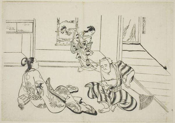 Okumura Masanobu created this woodblock print, "The Sakaki Chapter from 'The Tale of Genji'," part of a series of Genji parodies, in Japan during the Edo period. Masanobu cleverly uses parody to critique the rigid social structures of his time. Here, we see a scene that riffs on the famous "Tale of Genji," a cornerstone of Japanese literature and aristocratic culture. By subverting this iconic story, Masanobu questions the exclusivity and seriousness often associated with high culture. The playful depiction of the characters and the informal setting challenge the traditional, idealized portrayals of court life. This piece serves as a social commentary, poking fun at the cultural elite and suggesting a more accessible, perhaps even democratic, view of art and literature. Further research into Edo-period social dynamics and the reception of "The Tale of Genji" would enrich our understanding of Masanobu's intentions and the artwork's cultural impact. Art history reminds us that meaning is always shaped by context.