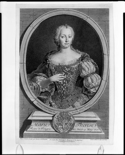 Editor: This is Johann Salomon Wahl’s portrait of Princess Charlotte Amalie, painted sometime between 1704 and 1765. It’s quite striking, the textures in the dress and the heavy folds of the robe create a dynamic sense of movement, despite the princess being posed. What formal elements stand out to you in this piece? Curator: The most compelling aspect is the manipulation of light. Observe how the artist directs it, not for realism, but to highlight textures. The sharp contrast defines the spatial relationship between the figure and the background. Editor: So, it's less about depicting her accurately and more about using light to structure the composition? Curator: Precisely. The chromatic scale may appear muted now, perhaps due to aging of the materials, but the artist’s choice of darker tones contributes to a somber and dignified mood. The portrait's structural components rely on geometric elements, contrasting the rounded figure with the sharp angles of the frame behind her. Note how her face seems strangely detached from the artifice surrounding her. Editor: I see what you mean. There’s almost a coldness despite the ornate details. Was Wahl aiming for a certain kind of emotional effect? Curator: Irrespective of emotional content, consider how the composition invites us to analyse the spatial organization and manipulation of form. This meticulous control speaks volumes about the artist's understanding of structure and aesthetics. Does it evoke any other considerations? Editor: I hadn't thought about it in terms of geometry and the interplay between the figure and background. I was so focused on who she was. Thanks for this breakdown! Curator: Analyzing the formal elements provides insight beyond historical context and biography, revealing the artist's choices and skill in crafting a visually structured piece.