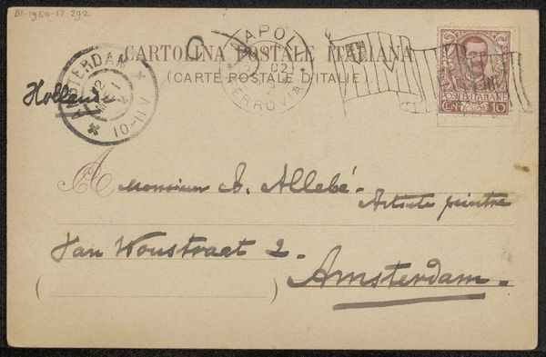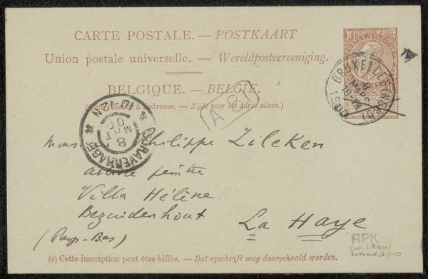 Curator: We’re looking at "Briefkaart aan Philip Zilcken," possibly created between 1900 and 1916. It’s a fascinating little piece featuring pen, ink, and photography. It shows the back of the postcard with calligraphy writing the recipient’s address and stamps on it. What’s your immediate impression? Editor: My first thought is how intimate it feels, like peeking at a private moment from over a century ago. The elegant handwriting and faded stamps speak of a slower time. But it also feels somewhat impersonal, merely documenting an act. Curator: Precisely. The choice of script tells us much. The very act of calligraphy lends a certain formality, an intentionality often missing in modern handwriting, making this correspondence read less pedestrian. Notice, too, the postal markings—literal stamps of bureaucratic systems, ensuring efficient distribution and commerce, influencing how we consume the "written" image today. Editor: I’m also drawn to the framing by these stamps and postal markings, anchoring the entire composition, elevating a simple mailing address into an almost sacred textual space of communication. What does the imagery suggest to you in the handwritten message? Curator: It depicts an address and nothing more, but that very information locates a person in time and space, creating a direct link to an individual and also hinting at the infrastructures and labor required to deliver it. It connects that person in Beuiten Hout to a wider network of distribution. It forces us to recognize postal service, for instance, not as background, but a technology to be grappled with and understood within its own historical and social situation. Editor: But consider the personal, human touch. This wasn’t simply about delivering a message; it was about maintaining a connection through visual cues embedded in the address, which could be more poetic than practical. This piece represents both distance and intimacy. Curator: I agree—I think it shows how visual language has always operated inside established structures, both embracing them, and subtly bending to suit specific contexts. Even something as seemingly utilitarian as this shows the powerful impact of material production and social process on a communicative work of art. Editor: It makes you consider all that it means to send or receive correspondence. An intriguing interplay between bureaucratic process and human connection, captured in a single image.
