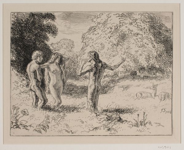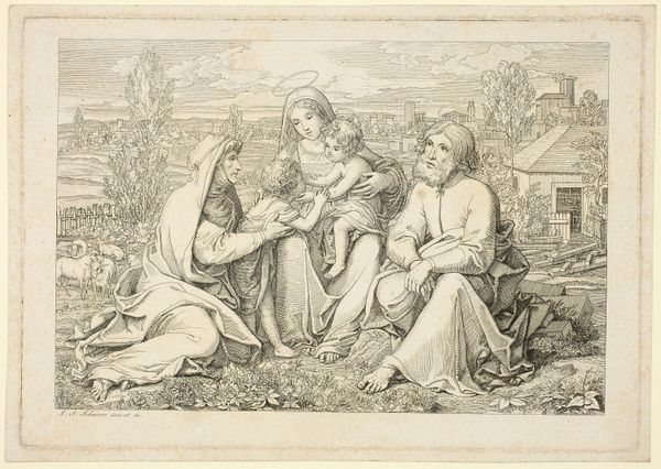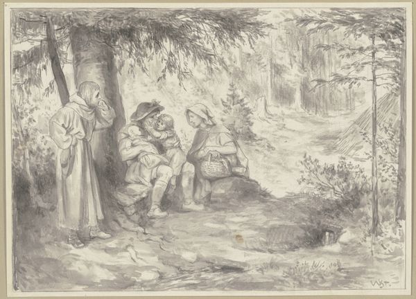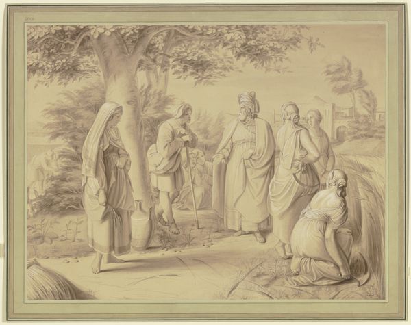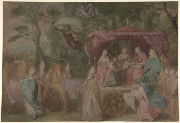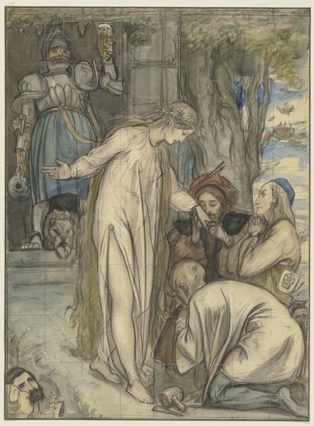 Editor: Here we have William Blake’s "The Agony in the Garden," part of the Tate collection. It’s… unsettling, almost dreamlike. What sociopolitical lens can we use to understand this Blake piece? Curator: Blake was deeply critical of the institutions of his time, especially the church and the state. Consider how he portrays Christ not as a figure of power, but as vulnerable, surrounded by children, under a tree. Editor: So, a critique of established authority through an appeal to innocence? Curator: Precisely. Blake's imagery often served as a form of protest against what he perceived as the corrupting influences of societal structures. Editor: That context really illuminates the piece. Thanks! Curator: Indeed. By questioning these institutions, Blake encouraged viewers to reconsider their own place within the social order.