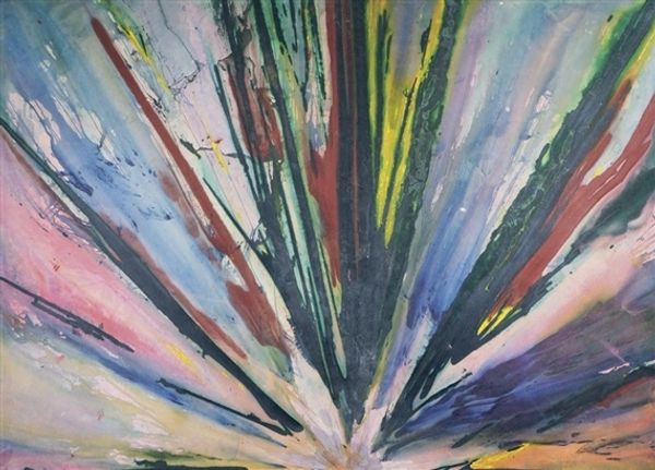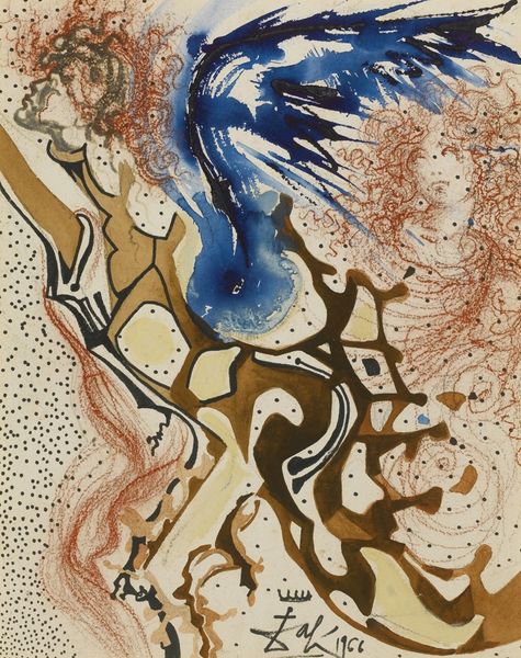 Editor: This is Christian Rohlfs' "Weiße Hyazinthe," painted in 1916. It’s an oil painting, and it's surprisingly gestural for a floral still life. It's all about the brushstrokes! What's your interpretation of Rohlfs’ choices here? Curator: Indeed, the handling of the medium is noteworthy. Observe how Rohlfs uses broad, almost crude strokes of contrasting colours – primarily blues, greens, and browns. This strategic deployment of chromatic elements serves to structure the composition; a fascinating dichotomy exists between representation and abstraction. Editor: Abstraction? I can definitely see a hyacinth, but where’s the abstraction coming in? Curator: The abstraction is most evident in the simplification of forms and the artist's departure from strict mimetic representation. The individual petals, for instance, are rendered as elongated strokes rather than meticulously detailed features. He's capturing the *idea* of the hyacinth, not necessarily the *appearance*. The juxtaposition of complementary colours such as red and green and the use of directional lines create a sense of movement and dynamism that might not be inherent in the still life subject itself. Consider the placement of the vase—what would you make of that square section on the left? Editor: It's just... there? An off-kilter brown block amidst the chaotic strokes. The whole painting feels unsettled, yet deliberately so. It brings focus back to the subject. Curator: Precisely. Note the composition. The off-center flower draws attention. Overall, this composition isn’t trying to hide behind traditional approaches; instead, its brushwork announces its intentions—its structure. What initially seemed like an amateur choice may instead by a way of drawing the eye, wouldn’t you agree? Editor: Yes! That tension between representation and… expression, perhaps, is really what makes it so compelling. It makes me wonder if that was a style in the time, Expressionism, versus intention for this artwork. Curator: A distinction well noted. The historical situation cannot ever completely remove the individual’s intentional expression when it comes to creating. This painting reveals the complex interrelations.