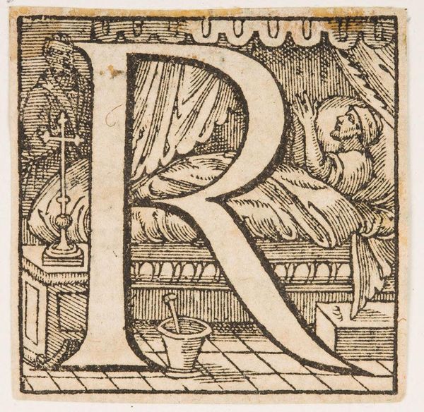 Editor: Here we have an intriguing woodcut initial, the Letter R, by an anonymous artist. I'm struck by the presence of Death within the letterform. What do you make of this image? Curator: The danse macabre motif was a common memento mori symbol. It's fascinating to see Death integrated so directly into the alphabet, a cornerstone of culture. What continuity do you see between past and present? Editor: I guess reminders of mortality were more explicit then. Curator: Indeed. Notice how the skeleton interacts with tools. Those were signs of labor and also agriculture, which has a connotation to nature, and to time. Are these symbols still effective today? Editor: I think the raw image of death always gets our attention. I learned how symbols change over time. Curator: And how they reflect our shared human anxieties.