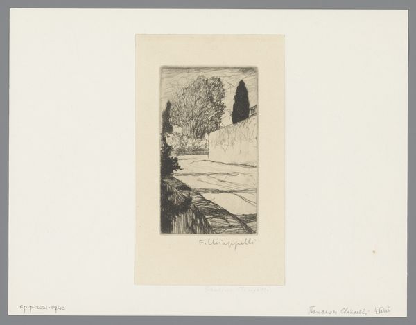 Curator: Here we have Cornelia Christina Johanna van Trigt-Hoevenaar’s drawing, "Kuiperspoort in Middelburg," likely created between 1864 and 1909, now residing here at the Rijksmuseum. It's rendered in pencil. Editor: It's wonderfully atmospheric, isn't it? The grayness lends the whole scene a kind of melancholy. A world rendered with soft graphite that appears almost haunted, like a place caught between sleep and waking. Curator: Indeed. What strikes me immediately is how the work reflects the increasing urbanization in the Netherlands during that period. Though quiet, the artist carefully delineates the architectural components against the encroachment of industrial modernity through that single point perspective. Editor: It is about transition, isn’t it? How society shifts its borders to incorporate the liminal. I keep wondering what function did this gateway serve, beyond physical entrance and egress? Was it a marker of privilege or perhaps even a segregation from within a complex system? Curator: Such gateways frequently held socio-economic meanings in a 19th-century urban fabric, simultaneously separating and regulating societal spheres. Consider, also, how the artist, as a woman, engages with what was predominantly a masculine sphere of landscape art at that time. Her focus is not on grand vistas but the quiet, lived spaces. Editor: I'm captivated by the way she captures the intimate intersection of the natural world and urban construction. There is an undeniable human quality, the ability of a drawing rendered in such simple grayscale, is profound. The perspective is inviting, but it doesn’t hide its complexity and raises critical awareness of class and gender. Curator: Precisely. It invites us to think about urban life and public space through a decidedly gendered lens. In exploring that very intersection between the urban structure and her personal interpretation of it. Editor: So, this drawing acts as a document of a period as much as it serves as a marker, pointing the way to considerations of space, accessibility, gender, and experience. I won’t see another cityscape drawing the same again. Curator: I completely agree. It highlights the power of these works to encapsulate the social complexities embedded within a seemingly simple landscape, forcing viewers to acknowledge how profoundly public and private realms can interlace.