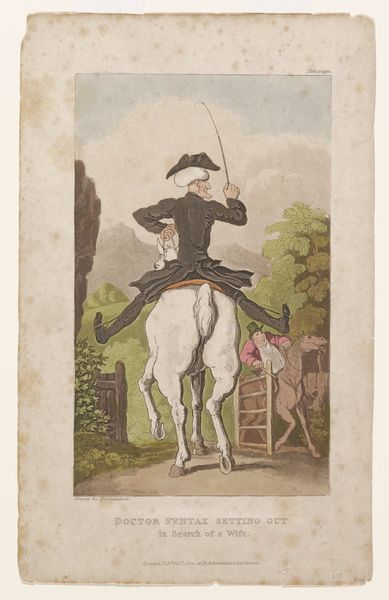 Curator: Here we have a print called "Vicar of Wakefield," by Thomas Rowlandson. It's undated, but we believe it originates from around the late 18th or early 19th century. What's your initial take on it? Editor: Immediately, I'm struck by the cartoonish exaggeration. The figures seem almost grotesquely caricatured, a playful, yet biting social commentary seems implied. Curator: Precisely. Rowlandson was a master of caricature, using it to expose the follies of the day. Observe how he uses line and wash; it is not merely descriptive. See the economy of line creating form and volume with an almost sculptural sensibility. Editor: I am also noting the narrative elements. The plump, overdressed figures perched precariously on the horse contrast sharply with the two young women on the left. It raises questions about status, privilege, and gendered expectations of the time. Is it a commentary on the excesses of the upper class and the objectification of women? Curator: Possibly, yes. We must remember Rowlandson worked in a milieu steeped in satirical prints. He engages the viewer, demanding an interpretation of each meticulously rendered line, shadow, and shape. Look at the positioning of each character—they function semiotically. Editor: And beyond formal arrangement, think about how these power dynamics play out in everyday life. The wealthy, the clergymen – those deemed 'respectable'– often uphold the very systems that oppress others. Rowlandson offers, perhaps, a critique of complicity itself. Curator: Absolutely. He doesn't simply present an image; he initiates a dialogue, making this unassuming watercolor drawing a remarkable reflection of Georgian society, full of complexities and ironies. Editor: Seeing Rowlandson's piece today, it acts as a vibrant reminder of how art can spark critical dialogues about historical injustices and also provoke fresh conversations about the continued manifestations of inequality within contemporary society.