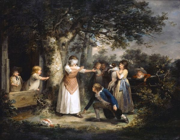 Editor: This is William Jones's 'Damon and Phillida Reconciled'. It's an oil on canvas, depicting a theatrical scene. What cultural narratives do you see reflected in this reconciliation scene? Curator: The painting captures a very specific theatrical moment. Note how the central couple, Damon and Phillida, occupy the brightly lit space, framed by darkness and… chaos? The figures in the background, frozen in attitudes of shock and mock horror, remind us of the performance's artifice. Editor: So, you see that artifice as a key symbol? Curator: Absolutely! It reflects the societal expectations around love and relationships at the time. Courtship was a performance, shaped by societal rules. And even reconciliation, as depicted here, becomes another act within that larger play. What do you make of the stage-like composition? Editor: That's insightful! I hadn't considered the 'performance' aspect beyond the immediate scene. It's definitely given me a fresh perspective.