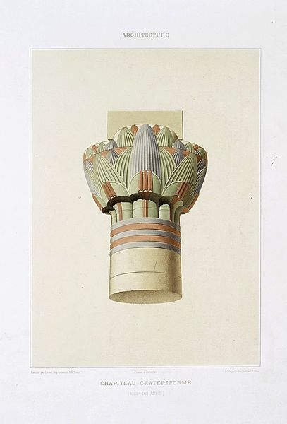 Émile Prisse d’Avennes made this print of a column in the hypostyle hall of Karnak, Thebes, using lithography sometime in the 19th century. Its rendering of ancient Egyptian architecture speaks to the European fascination with Egypt during that period, and reveals the cultural and political context in which such images were produced and consumed. This print offers a detailed view of the column’s capital, decorated with stylized lotus flowers and hieroglyphs. We see the influence of ancient Egyptian culture on European art and architecture. The use of lithography allowed for the mass production of such images, making them accessible to a wider audience and contributing to the spread of Egyptomania. The print also reflects the power dynamics of the time, with European artists and scholars appropriating and reinterpreting Egyptian culture for their own purposes. Careful archival research might reveal the specific motivations and intentions behind its creation, shedding light on the complex interplay between art, culture, and power in the 19th century.