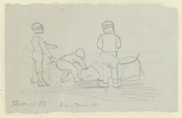 Curator: This is Honoré Daumier's lithograph, "Having Decided to Wait in Case a Bird Decides to Pass By." Editor: The composition strikes me as rather static, despite the implied activity. The figures are almost sculptural in their immobility. Curator: Indeed, Daumier cleverly uses stark contrasts and cross-hatching to create a sense of weariness. Note the slumped posture of the sleeping hunter and the dog’s unwavering gaze. Editor: It’s a potent commentary on human expectation, the dog embodying alert focus, the men succumbing to lethargy. Are we, perhaps, also waiting, hoping for something that may never arrive? Curator: The image certainly invites reflection on themes of patience, futility, and perhaps the absurdity of our endeavors. Editor: A deceptively simple scene, rendered with a complexity that rewards deeper contemplation.
