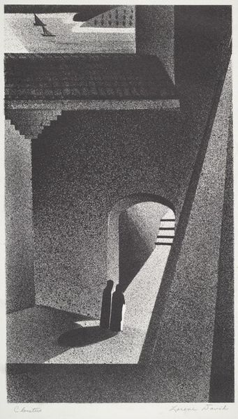 Editor: This etching by Arend Hendriks, called "Trap," made sometime between 1911 and 1943, depicts a dark staircase with, what I think are, glowing eyes at the top of the stairs. The deep shadows definitely create a sense of unease. What do you see in this piece? Curator: I see a potent commentary on spatial confinement and psychological unease, which, considering the era, could speak volumes about the interwar period and the rise of totalitarian regimes. Look at how the geometric rigidity of the stairs contrasts with the organic curve of the railing, creating a visual dissonance, and how that tension creates meaning. Who is being trapped, and by what? Is it physical, or societal expectations and constraints? Editor: That's interesting, I was just thinking it was kind of creepy! Are you saying it might be a metaphor? Curator: Art often operates on multiple levels, inviting viewers to consider both the immediate sensory experience and its underlying sociopolitical contexts. Hendriks might be using this claustrophobic space to mirror the oppressive atmosphere that many Europeans experienced. Does that reading shift how you understand the work? Editor: It does. I was stuck on the literal image, but considering the historical context adds a whole new layer. It's like the "trap" is society itself. Curator: Exactly. The stark contrast of light and shadow, almost a stage lighting effect, can represent the stark choices individuals faced during that time—conformity or resistance, visibility or obscurity. Think about who might be lurking in the shadows, watching. Does it feel predatory? Editor: Definitely predatory. Seeing those eyes now, it feels like being watched, scrutinized, like there's no escape. I appreciate you making me see it differently. Curator: And I appreciate your openness. It's through this kind of engaged dialogue that we can excavate the hidden depths within these seemingly simple images and understand them in all of their cultural nuance.