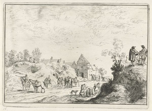 Editor: Here we have "Paardenmarkt", a pencil drawing made sometime between 1600 and 1630 by Esaias van de Velde. It’s a pretty lively market scene. So many people gathered around these majestic horses! It gives me a feeling like peering into another time. What do you see in this piece, something that I might have missed? Curator: Well, my eye is drawn to the chaos, that controlled frenzy of a marketplace from centuries past. Look at the dust rising from the ground – you can almost smell the sweat of the horses and the merchants vying for attention! Notice also how Van de Velde uses the subtle gradations of pencil to create a sense of depth; it’s like the world fades into the distance. Does it remind you of anything? Perhaps a stage? Editor: Definitely theatrical. It feels as though the artist has set us right in the front row for this interesting play that happens in Dutch horse marketplace. Why the almost total absence of color, I wonder? Curator: Think of it as realism served raw. The lack of color makes us focus on the raw line work and texture. And that horse rearing up! You can see the energy in its muscles, the slight fear in its eyes, which pulls us right into the center of the exchange. I like to imagine how, centuries later, someone like George Stubbs might’ve seen this sketch and thought: inspiration! Editor: Wow, you've really brought out the vibrant intensity within the subtle grays. I can almost hear the whinnies and the bargaining now. Curator: Art whispers stories to those who lean in close enough. It's a constant, thrilling dialogue. And, really, what’s life but a big marketplace? Editor: That’s something I will certainly keep in my mind. Thanks!