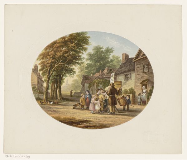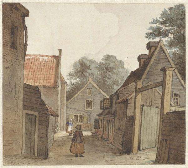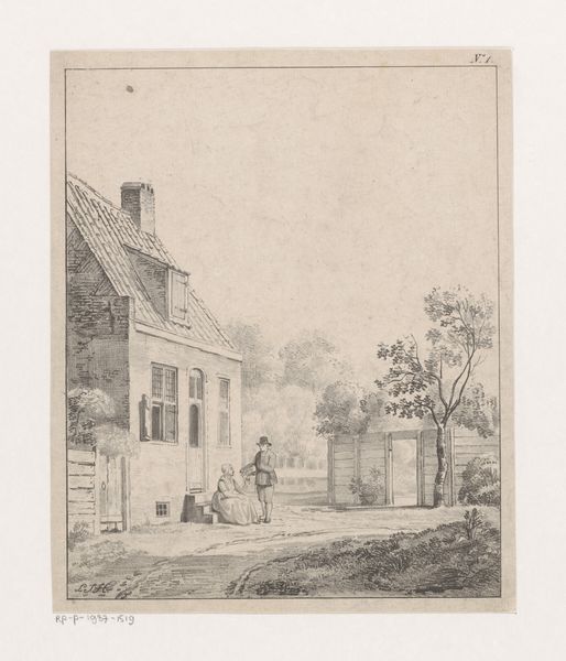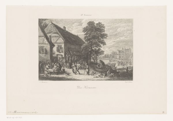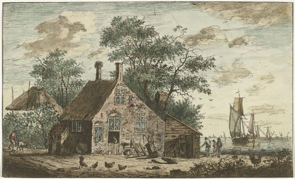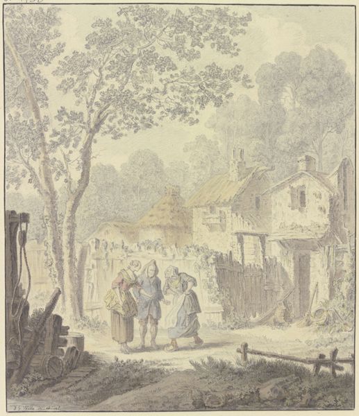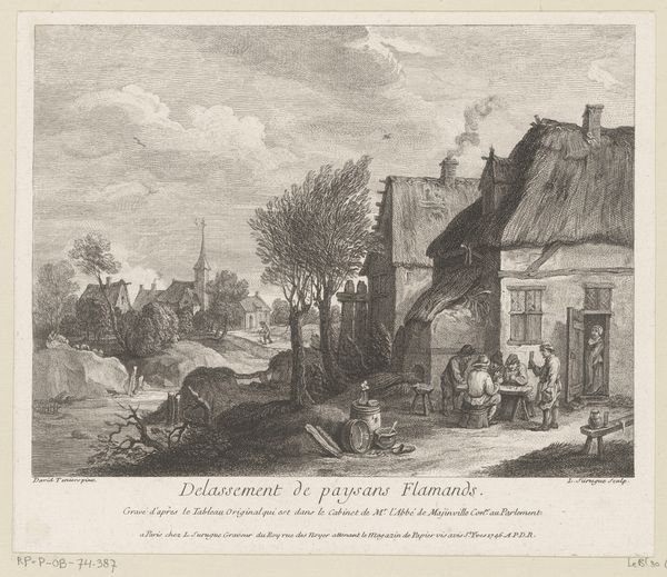 Editor: So, this is "The Rustic Hut," an etching and engraving by Jean François Janinet, from 1774. The details of daily life give this a narrative feel... almost like stumbling onto a scene from a play. What do you think draws our eyes in, beyond just the domestic tranquility? Curator: Isn’t it interesting how Janinet takes something so ordinary and imbues it with… well, not quite grandeur, but certainly a sense of importance? This scene, frozen in time, feels less like simple genre-painting and edges towards a history, a social document if you will, albeit viewed through rose-tinted spectacles. It's a memory, perhaps? What details particularly arrest your attention? Editor: The figures for sure! The way they are positioned and angled… is that intended to direct us through the piece? Curator: Absolutely! See how your eye naturally moves from the children playing to the central family activities within the hut, finally drifting upwards to the details of the architecture itself? The house, with its humble air, dominates the whole view. Consider what he wanted to communicate about social class in this snapshot of late 18th-century life. Perhaps this picturesque scene served to contrast the idealized view with some viewers' reality? Editor: I hadn't considered that… Curator: And the overgrown greenery around the home... that hints towards a Romantic sensibility and hints toward decay... an idealized memory can never exist, except in the artist’s impression, of course. That’s food for thought, I hope. Editor: Definitely. It feels less simple, now! Curator: Precisely. A “rustic hut” then becomes something quite provocative, eh?